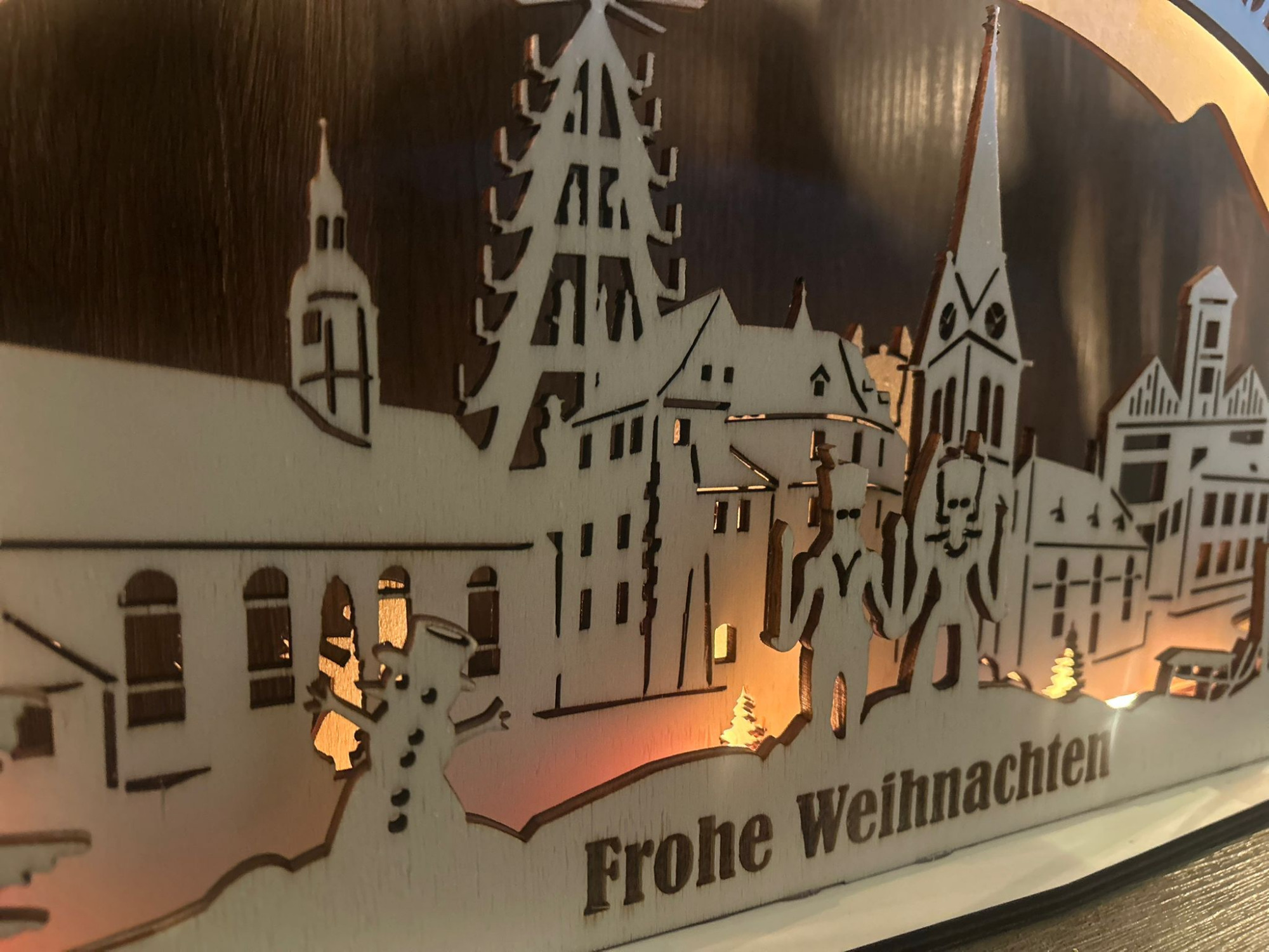 Ein exklusiver Mehrschicht-Schwibbogen mit der charakteristischen Lichtenberger Silhouette. Sie sehen die Wahrzeichen wie Kirche, Pyramide, Schule uvm.